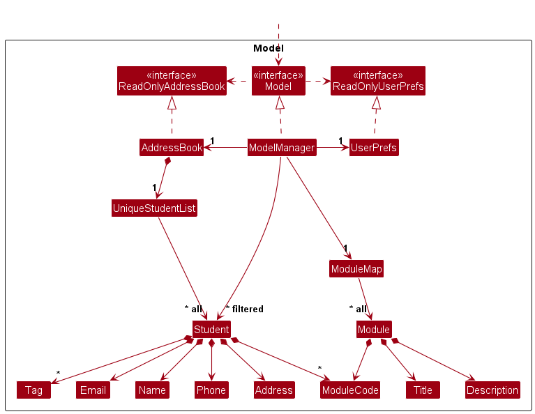 To provide some context, given below is the class diagram of theModelcomponent. See if you can figure out where the ‘filtered list’ of students is being tracked.