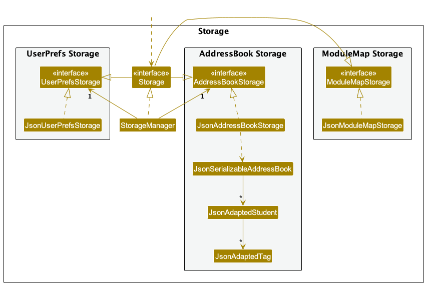 Storagecomponent, you will eventually arrive at theJsonAddressBook#saveAddressBook()method which calls theJsonSerializableAddressBookconstructor, to create an object that can be serialized (i.e., stored in storage medium) in JSON format. That constructor is given below (with added line breaks for easier readability):JsonSerializableAddressBookconstructor:/** * Converts a given {@code ReadOnlyAddressBook} into this class for Jackson use. * * @param source future changes to this will not affect the created * {@code JsonSerializableAddressBook}. */ public JsonSerializableAddressBook(ReadOnlyAddressBook source) { students.addAll( source.getStudentList() .stream() .map(JsonAdaptedStudent::new) .collect(Collectors.toList())); } -