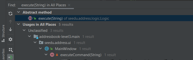 According to the sequence diagram you saw earlier (and repeated above for reference), the UI component yields control to the Logic component through a method named execute. Searching through the code base for an execute() method that belongs to the Logic component yields a promising candidate in seedu.address.logic.Logic.